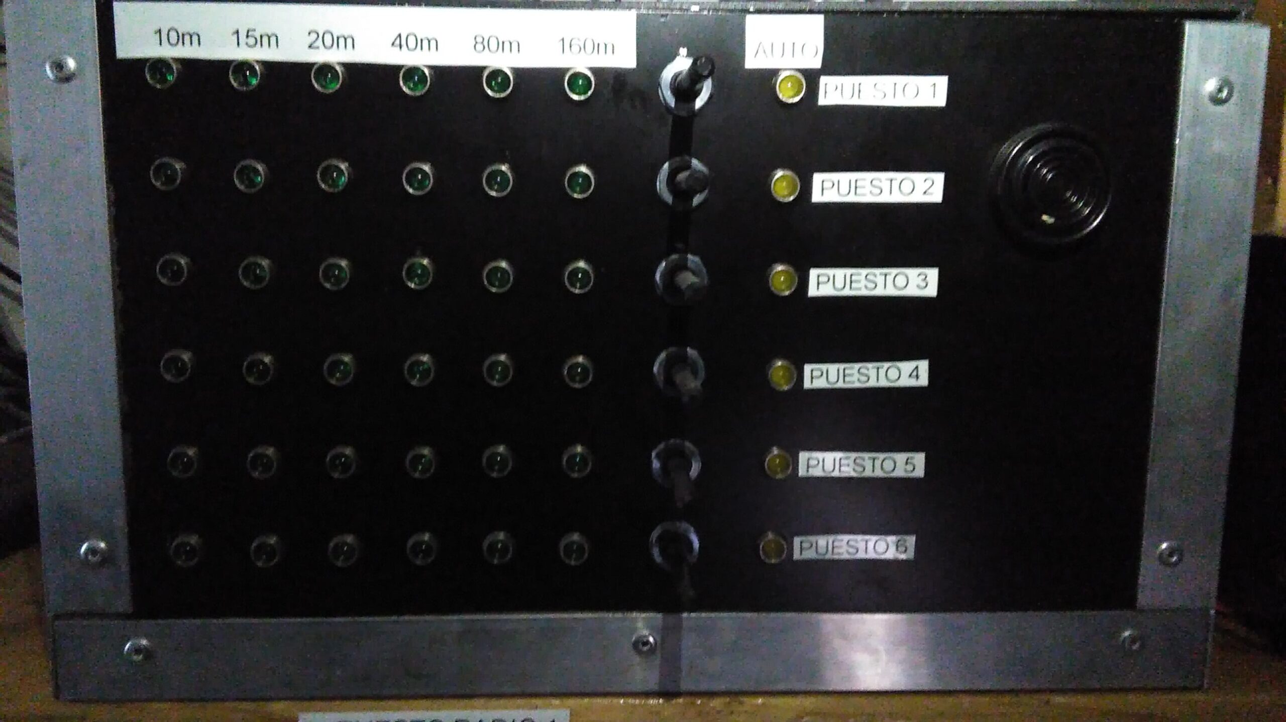 Las salidas son las que utilizaremos para controlar no solo el sistema de la parte de RF del 6×6, estas salidas serán la referencia que utilizaremos en caso de querer automatizar el resto de periféricos en nuestra estación. Desde aquí se seleccionarán automáticamente por ejemplo los filtros pasa banda de transmisión y los filtros de recepción que necesitemos en cada momento, ahorrando tiempo a la hora de hacer los cambios de bandas y evitando errores muy comunes si ya llevamos 30h de concurso. No se explica detalladamente pero se sobre entiende que este sistema solo permite una banda por puesto simultáneamente, si en algún momento por error uno de los puestos de radio coincide con otro puesto en la misma banda emite un aviso acústico perfectamente audible y no permite seleccionar esta banda al puesto “profanador”, el aviso acústico solo dejará de sonar cuando desaparezca el “peligro”. El sistema ha sido probado durante el último año de concursos y los resultados han sido satisfactorios, mayor aislamiento que un six pack tradicional y mayor flexibilidad a la hora de planificar un concurso en equipo. La placa de control la alojé en otra caja de aluminio autoconstruida y como todo el proyecto, se montó en base a las necesidades de la estación, mediante una matriz de leds, con un simple vistazo podremos ver en que banda se encuentra cada puesto de radio, como se ha explicado en el anterior párrafo, a esta caja llegan los cables de mando de cada puesto y desde esta caja, gobernada por la placa de control, se envía la señal de mando a todos los periféricos.