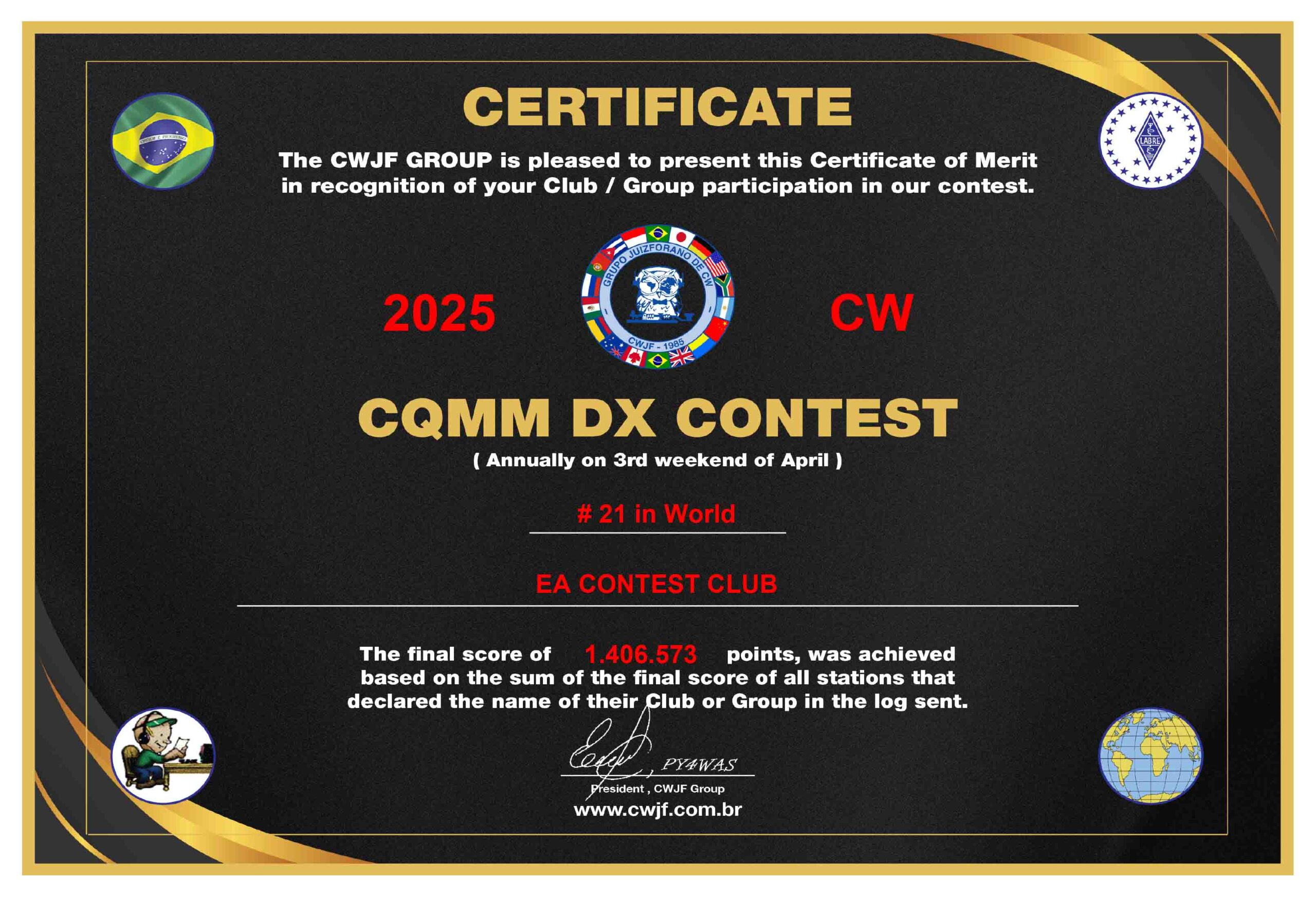 Nos complace compartir con todos vosotros el diploma oficial del CQ MM DX Contest 2025, donde el EA CONTEST CLUB ha logrado un resultado extraordinario: